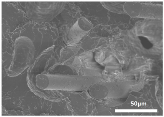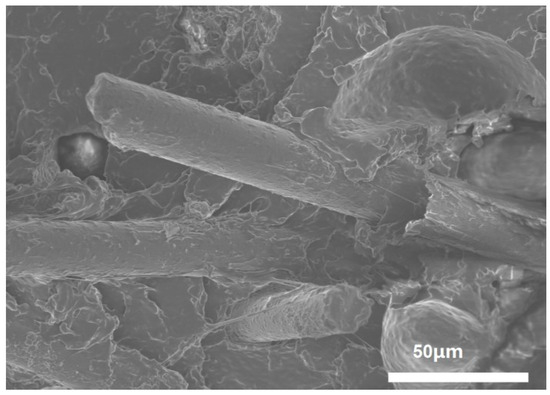 The best mechanical properties were found for 1.0 wt%KH550-B4/PUE. SEM analysis of its tensile section is shown in Figure 10. It can be seen that the fibers are interspersed in the polyurethane matrix, and the fibers and the matrix are tightly bonded and have evident bonding. Upon exposure to external forces, composite materials leverage high-strength, high-modulus basalt fibers as their structural skeleton, which endures a portion of the load. As these fibers debond and are extracted from the polyurethane matrix, the interaction between basalt fibers and the PUE matrix induces them to carry an additional portion of the load, thereby enhancing the mechanical properties of the composite. Furthermore, chemical modifications with KH550 or KH560 generated a stronger chemical bond between the fibers and the PUE matrix, leading to improved interfacial adhesion.