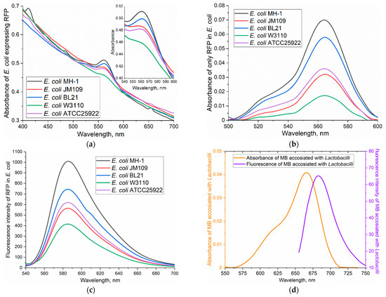 (a) Molecular absorption spectra of bacterial suspensions (4 × 108 CFU/mL) of E. coli MH-1, JM109, BL21, W3110 and ATCC25922 expressing red fluorescent protein (RFP). (b) Molecular absorption spectra of only RFP in the same bacterial suspensions. (c) Fluorescent spectra of the same bacterial suspensions (4 × 108 CFU/mL) of E. coli MH-1, JM109, BL21, W3110 and ATCC25922 at λexci of 520 nm. (d) Molecular absorption and fluorescent spectra of Lactobacilli cells stained with methylene blue (MB) at λexci of 630 nm and T = 37 °C.