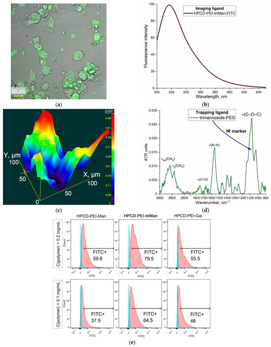 The following supporting information can be downloaded at: https://www.mdpi.com/article/10.3390/polym17010065/s1, Figure S1: (a) The scheme of synthesis of the trimannoside-PEG (triMan–PEG) trapping ligand. (b) FTIR spectra of the initial substances and the target product. PBS (0.01 M, pH 7.4). T = 22 °C. Figure S2: (a) Scheme of synthesis; and (b) FTIR spectrum of FITC-labeled HPCD-PEI-triMan ligand for macrophage imaging. PBS (0.01 M, pH 7.4). T = 22 °C. Figure S3. Confocal laser scanning microscopy images of CD206+ macrophages derived from BALF after 4h-incubation with different E. coli cells in presence of Lactobacilli competitor. Macrophage were stained with FITC anti-CD206 ligand (HPCD-PEI1.8-triMan-FITC)—green channel (λex,max = 488 nm; λemi = 505–555 nm). E. coli cells were stained RFP—red channel (λex,max = 559 nm; λemi = 575–625 nm). Lactobacilli cells were stained methylene blue (MB)—cyan channel (λex,max = 635 nm; λemi = 650–750 nm).