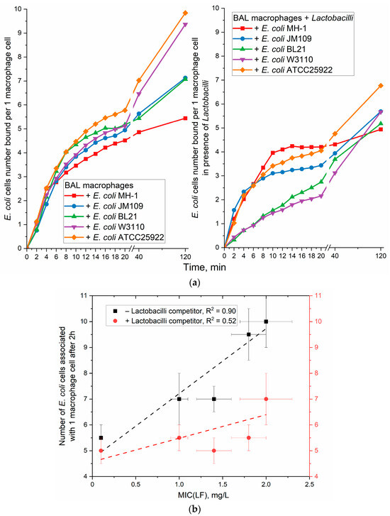 A fluorometric analysis of the kinetics of the phagocytic response of Mph towards E. coli was conducted in the presence or absence of Lactobacilli as competing cells. The rate of E. coli adhesion to macrophages was determined by measuring RFP fluorescence. In the absence of Lactobacillus, E. coli was captured by macrophages at a rate corresponding to approximately four to six bacterial E. coli cells adhering to each Mph cell in hour. In the presence of Lactobacilli as a competitor, the binding capacity was reduced by two times. A clear correlation is observed between the minimum inhibitory concentration (MIC) of an antibiotic and the capacity of macrophages to attach to these microorganisms.