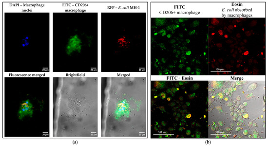(a) Confocal laser scanning microscopy images of CD206+ macrophages derived from BALF after 4 h of incubation with E. coli MH-1 cells in the presence of Lactobacilli competitor cells. Macrophage nuclei were stained with DAPI (λex,max = 360 nm; λemi = 400–500 nm); macrophages were stained with FITC anti-CD206 ligand (HPCD-PEI1.8-triMan-FITC)—green channel (λex,max = 488 nm; λemi = 505–555 nm). E. coli cells were stained RFP—red channel (λex,max = 559 nm; λemi = 575–625 nm). (b) Confocal laser scanning microscopy images of CD206+ macrophages derived from model human THP-1 monocytes after 4 h of incubation with E. coli MH-1 cells in the presence of Lactobacilli cells. Macrophages were stained with FITC anti-CD206 ligand (HPCD-PEI1.8-triMan-FITC)—green channel (λex,max = 488 nm; λemi = 500–520 nm). E. coli cells were stained with eosin (covalent)—red channel (λex,max = 515 nm; λemi = 530–600 nm).