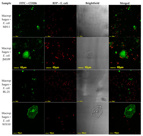 Confocal laser scanning microscopy images of CD206+ macrophages derived from BALF after 4 h of incubation with different E. coli cells. Macrophages were stained with FITC anti-CD206 ligand (HPCD-PEI1.8-triMan-FITC)—green channel (λex,max = 488 nm; λemi = 505–555 nm). E. coli cells were stained RFP—red channel (λex,max = 559 nm; λemi = 575–625 nm).