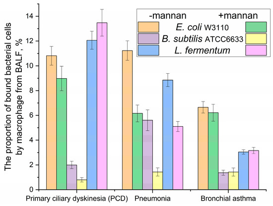 The relationship between the patients’ diagnostic results and the phagocytic activity of macrophages was analyzed (Figure 8). The proportion of bacterial cells associated with CD206 + macrophages from the BALF was affected by the presence of mannan, a competitive ligand for CD206 mannose receptors, which play a key role in bacterial phagocytosis by macrophages. In the absence of mannan, E. coli W3110 exhibits a relatively high level of bacterial phagocytosis, approximately 10%, for all of the patient categories. However, the presence of mannan (the CD 206 concurrent ligand) strongly inhibits bacterial binding by macrophages in cases of pneumonia, in which macrophages overexpress CD206 receptors.
