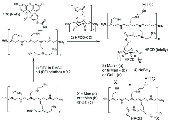 Finally, a 5-fold molar excess of a trimannoside derivative (triMan) relative to PEI chains was added to the HPCD-PEI-FITC solution. Additionally, NaBH3CN was introduced in an amount that was 1.5 times the molar excess compared to triMan. The resulting mixture was subjected to incubation for 24 h at a pH of 5 and a temperature of 45 °C, followed by 12 additional hours of purification through dialysis using a membrane with a cut-off range of 6–8 kDa against distilled water.