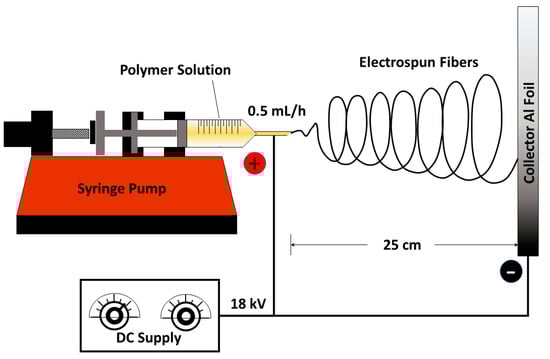 Electrospinning is an efficient technique used in the biomedical field to produce functional nanofibers from synthetic and natural polymers by applying high voltage to a polymer solution [,]. The process begins when the electrostatic force overcomes the surface tension of the solution, resulting in the formation of a Taylor cone at the nozzle tip. A charged polymer jet is subsequently ejected, undergoing rapid stretching and thinning due to electrostatic repulsion and solvent evaporation, which ultimately leads to the formation of nanometer-scale fibers [].
