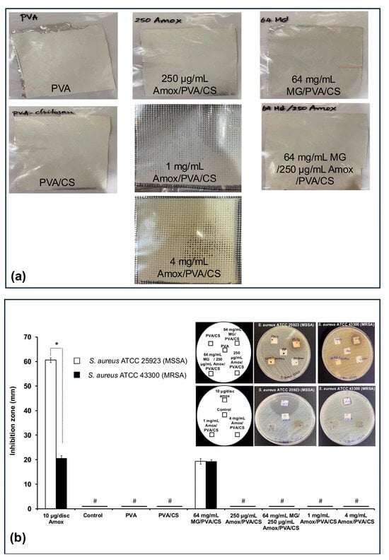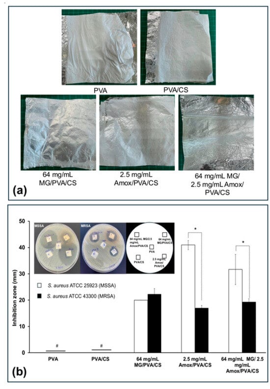 (a) Images of the electrospun nanofiber mat and (b) the antibacterial activities of the formulation set C; 64 mg MG/PVA/CS, 25 mg Amox/PVA/CS, and 64 mg MG/25 mg Amox/PVA/CS nanofiber mats, compared with neat PVA and PVA/CS against S. aureus ATCC 25923 (MSSA) and 43300 (MRSA). Each symbol indicates the mean ± S.D. (n = 3). # The inhibition zone could not be determined. * Significant difference between the mean inhibition zones of the two bacterial strains, p < 0.05.