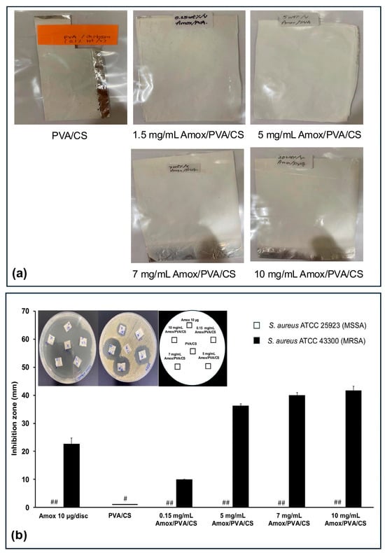 According to the literature, acetic acid is commonly used to solubilize CS and PVA for film production or nanofiber fabrication [,,]. In this study, 10% wt/v PVA and 0.1% wt/v CS were dissolved in 20% v/v acetic acid before incorporating active compounds in formulation set A. The PVA/CS electrospun mats loaded with 64 mg/mL MG and/or 250 μg/mL Amox exhibited a white, opaque appearance similar to the neat mats (Figure 2a). The antibacterial activities of the mats are presented in Figure 2b. For the neat PVA or PVA/CS mats, no inhibition zones were observed against either MSSA or MRSA strains, indicating the absence of anti-S. aureus activity. This result aligns with previous reports, which found that pure 5 wt% PVA or 1 wt% CS films did not exhibit antibacterial properties [,]. However, blending higher concentrations of CS (4 wt%) with PVA (10 wt%) demonstrated a partial reduction in bacterial growth under the specimens on agar plates [,].