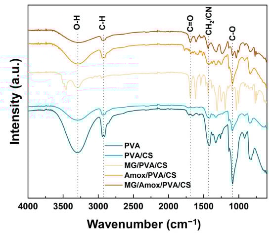 FTIR spectra of PVA, PVA/CS, MG/PVA/CS, Amox/PVA/CS, and MG/Amox/PVA/CS nanofibers from formulation set C.