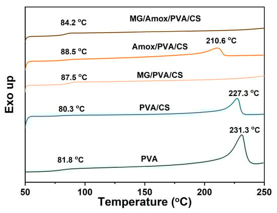DSC thermograms of PVA, PVA/CS, MG/PVA/CS Amox/PVA/CS, and MG/Amox/PVA/CS nanofibers from formulation set C (heating rate 5 °C/min).