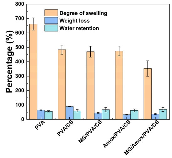 Percentage of swelling degree, weight loss, and water retention of PVA, PVA/CS, MG/PVA/CS, Amox/PVA/CS, and MG/Amox/PVA/CS nanofiber from formulation set C. Data shown as mean ± S.D. (n = 3).