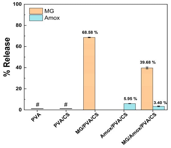 The 24 h release of MG and Amox was analyzed to explain the anti-S. aureus activity observed after applying the fiber mat to a bacterial agar plate for 24 h. As shown in Figure 9, the release of MG and Amox from the PVA/CS nanofiber mat into DI water was measured over the same period. For the neat PVA and PVA/CS samples without active compounds, no detectable MG or Amox was observed in the release solution, confirming the absence of these compounds in the respective formulations. For the PVA/CS nanofiber mat loaded with a single active compound, MG was released at approximately 68.58%, while the release of Amox was significantly lower at only 5.95%. Because Amox is a poor water soluble drug of 2.7 mg/mL [], the hydrophobicity of Amox may explain the low drug release from the PVA/CS mat. This result agreed with previous study of Sofokleous et al., who studied the release of Amox from poly(D,L-lactide-co-glycolide) (PLGA) electrospun fiber []. The drug release from the PLGA electrospun fiber was found to be lower than 10% within 24 h in distilled water and reach 68% within 21-day release period []. In the case of the MG/Amox/PVA/CS composite, the release percentages of both MG and Amox were significantly reduced by approximately 42% compared to the single-compound-loaded samples, possibly due to their low degree of swelling. Additionally, MG/Amox/PVA/CS mats with larger fiber and bead diameters led to a smaller surface area for compound release compared to single-compound-loaded PVA/CS mats. Additionally, the larger fiber and bead diameters of the MG/Amox/PVA/CS mats result in a smaller surface area for compound release compared to single-compound-loaded PVA/CS mats. These characteristics explain the differences in anti-MRSA efficacy of MG and Amox observed between the in vitro study and the fiber-formulated mats.