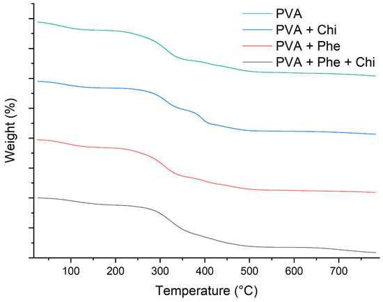 | PVA/Phe | 25–174 | 174–366 | 366–569 | 569–644 |
