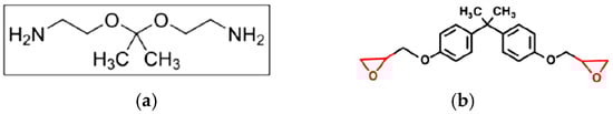 Previous studies [17] have characterized the Recyclamine™ R*101 hardener, which contains cleavable ketal groups within the cross-linked network. These groups can be selectively broken under mildly acidic conditions, allowing for the depolymerization of the cured matrix and the recovery of both the polymer and reinforcing fibers. The chemical structure of R*101, shown in Figure 2a, serves as a representative example of this class of materials. Similarly, Recyclamine™ R*LAB005 can be assumed to share this functional mechanism, as it belongs to the same family of cleavable hardeners. Furthermore, the Beluga Whale resin shares similarities with the Polar Bear resin described in the literature [4], which contains 28% bio-based carbon (expressed as a fraction of total organic carbon), as shown in Figure 2b. By referencing these well-characterized systems, such as Recyclamine™ R*101 and Polar Bear, we provide a solid framework to understand the chemical behavior and recyclability of the Beluga Whale/Recyclamine™ R*LAB005 system studied here.
