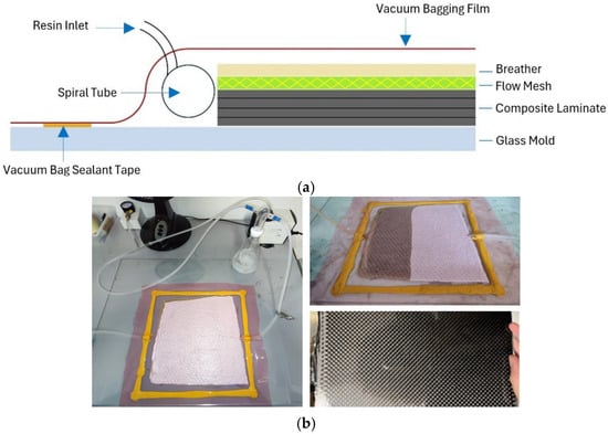 Vacuum-assisted resin transfer molding system designed for the laminates fabrication: (a) schematic of the system and (b) experimental set-up.