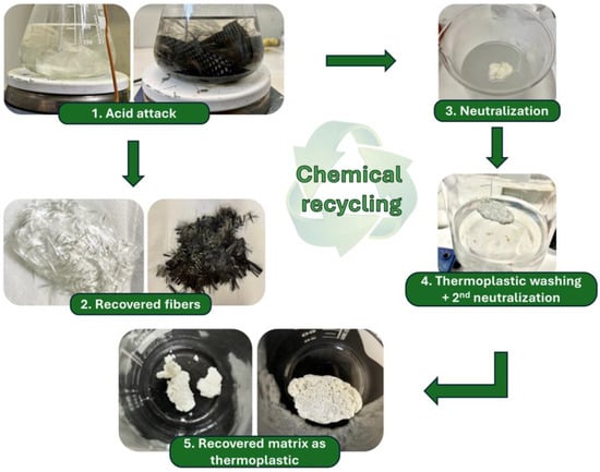 After the thermal and mechanical characterization of the composite laminates, the materials were subjected to a recycling process following the experimental protocol implemented by Cicala et al. [19]. The first step is an acid attack, where about 10–11 g of composite material is immersed in 300 mL of acetic solution (40 vol.% of acetic acid). Acetic acid (purity level 99.8%) was purchased from Honeywell. The solution is brought up to 80 °C and left to react for 2.5 h. Once the thermoset matrix is dissolved, the fibers are filtered from the solution, then washed in distilled water and left to dry. At this point, the acid solution, remaining at a temperature of 80 °C, is neutralized with 105 mL of a 2 M aqueous solution of NaOH (Carlo Erba Reagents S.A.S., Val-de-Reuil, France). By introducing the basic solution into the acid, therefore, a precipitate forms progressively. That corresponds to the thermoset matrix recovered as a thermoplastic polymer. Once all the basic solutions have been introduced with a pipette, the system is left to react and cool to a temperature of 40 °C. Next, the thermoplastic is filtered from the solution and washed with 150 mL of distilled water. A few drops of basic solution are added to aggregate the precipitates, always using a pipette. In the end, the polymer obtained is filtered and left to dry. The workflow of the recycling procedure is illustrated in Figure 4.