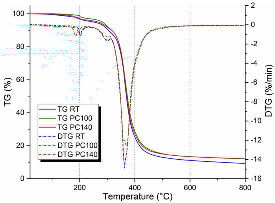 The thermogravimetry (TG) and derivative thermogravimetry (DTG) curves of the resin post-cured under different conditions (RT, PC100, and PC140) are reported in Figure 5. The graph clearly shows that the weight loss occurs in two steps. The first degradation stage was concentrated in the 180–200 °C temperature range with a mass change of about −5 wt.%. Within the temperature range of 340–370 °C, the main degradation event was observed, with a massive loss in weight of about 80%. In this stage, the thermal decomposition took place for the bio-epoxy resins. Table 1 summarizes the maximum temperature of the two degradative processes undergone by the resin. TI stands for the maximum temperature related to the first weight loss, whereas Tmax refers to the maximum temperature at which the main degradation process occurs. TGA results highlighted that the non-post-cured resin showed slightly superior thermal stability compared to the cured ones. Furthermore, as the post-cure temperature increases, the thermal stability of the polymer decreases. This result can be explained by considering the thermo-degradative effects that the resin experiences due to the presence of a “bio” component in its chemical structure. Indeed, these types of polymers have a substantial portion of the carbon content replaced by a biomass origin that is sensitive to high-temperature stress [24]. In agreement with the DTG analyses reported by di Mauro et al. [25] and considering the chemical structure of the R-Concept bio-epoxy system [4], bio-based thermosets follow a two-step thermal degradation mechanism, as also reported by Supanchaiyamat et al. [26]. The first degradation step is attributed to the breakage of ester linkages in the polymer’s crosslinked structure. These linkages, introduced during the curing process through the reaction between epoxy groups and functional groups of the hardeners, are chemically labile and break at low temperatures. This process leads to the formation of low molecular weight intermediate fragments. The second degradation step, on the other hand, is related to the thermal cleavage of these intermediate fragments, occurring at higher temperatures. This phenomenon represents the complete disintegration of the polymer network, causing a rapid increase in mass loss. The presence of two distinct degradation events is clearly visible in the DTG curves [25] and allows for the identification of the contribution of each phase to the overall thermal behavior of bio-based thermosets.