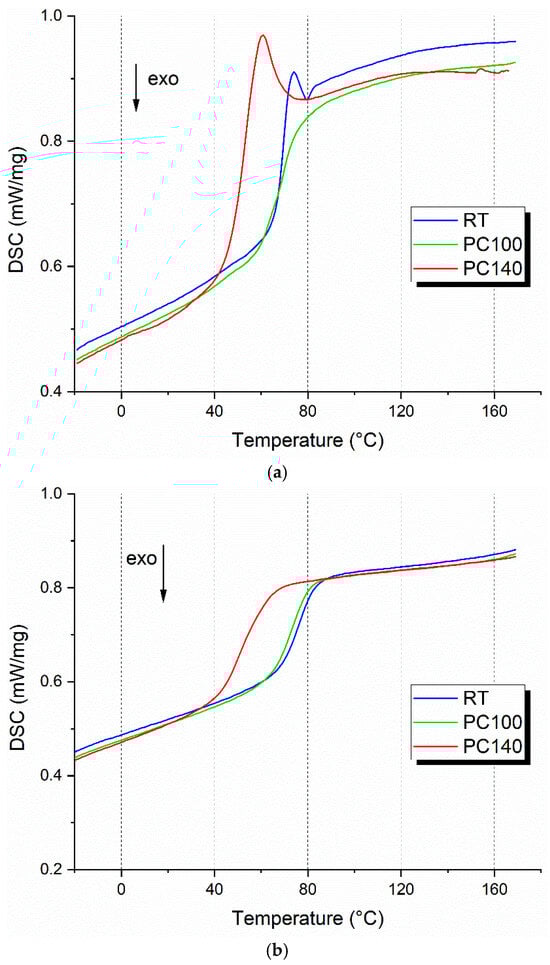 First (a) and second (b) heating scan DSC curves of bio-epoxy resins post-cured at different conditions: RT, PC100, PC140.