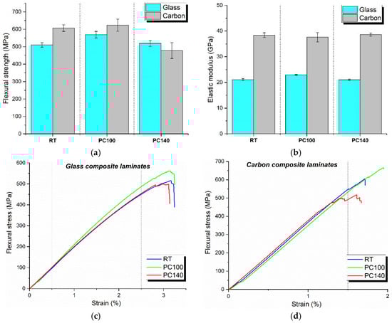 Figure 7 displays the effect of different post-curing regimes on the flexural behavior of carbon and glass composite laminates. As expected, the carbon laminates outperformed the glass-based ones. From Figure 7a, the carbon fiber-reinforced laminate showed higher flexural strength for RT and PC100 conditions (607 MPa and 624 MPa, respectively). The flexural strengths of glass fiber-reinforced composites were 510 MPa and 569 MPa for RT and PC100 post-curing, respectively. Therefore, compared to the neat matrix, the post-cure treatment at 100 °C on composites was effective in improving the mechanical properties. Although the insertion of the fiber layer reduces the macromolecular mobility and the proper matrix crosslinking degree, a well-balanced post-cure treatment would assist the increment in crosslink density and interfacial bonding with the fibers [31]. However, the post-cure treatment at 140 °C was excessive, leading to a reduction in flexural strength (–10% for glass laminate and −23% for carbon laminate over to the composites post-cured under PC100 condition). Too high post-curing temperatures would cause excessive resin shrinkage and the development of residual stresses at the fiber-matrix interface (debonding) [32]. PC140 treatment degraded carbon-based laminates more significantly than glass-reinforced ones. It is plausible that this effect is also associated with the different degrees of compaction experienced by the two types of fabrics under the same processing conditions used to produce the composites. The SEM investigation in the next section will clarify this aspect. As shown in Figure 7b and on the stress-strain plots displayed in Figure 7c,d, post-cure has a negligible effect on the laminate stiffness in their corresponding groups. This evidence agrees with the one reported in earlier works by Umarfarooq et al. [31].