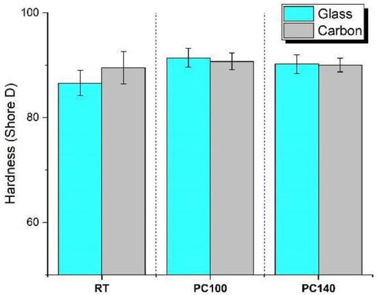 Shore D hardness of the laminates (Figure 8) was weakly influenced by both the type of reinforcement and the post-cure treatment. However, the results show a slight improvement in hardness in the case of PC100 laminates, corroborating the flexural test results. An optimal post-curing regime improves the bonding between fibers and resin, due to an increase in cross-linking and stacking, which, although generally reducing polymer chain mobility, may also lead to an increment in Tg, thus enhancing resistance to the penetration of the indenter [33].