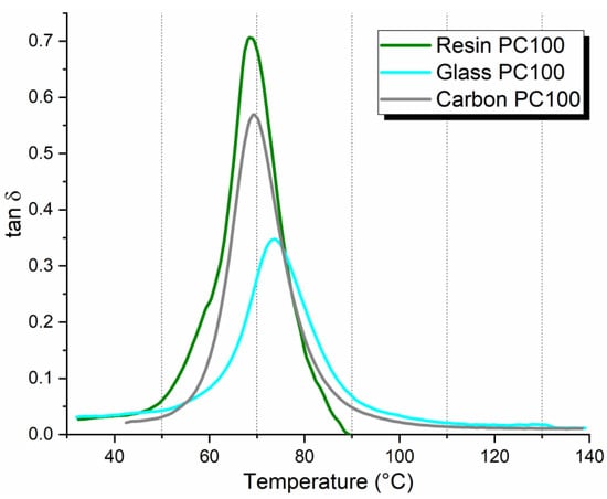 DMA test results: tan δ vs. temperature for plain resin, glass, and carbon laminates post-cured under the PC100 regime.