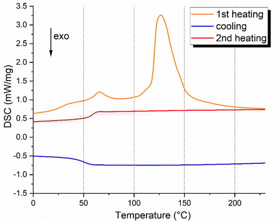 The DSC thermogram of the recovered polymer is displayed in Figure 14. As also verified from TGA, the first heating curve showed a broad endotherm around 100–150 °C, representing the loss of moisture from the sample. The Tg was determined from the second heating curve, obtaining a value of 59.4 °C. This value falls within the representative range of glass transition temperature of these polymer systems listed in Ref. [40]. As expected, the achieved Tg is lower than those of bio-epoxy resins due to the conversion of the network into a linear structure typical of thermoplastics. The referenced study also reported promising mechanical properties for these recovered polymers (tensile modulus of 2.4 GPa and tensile strength of 57 MPa), demonstrating good potential for new applications and competitiveness with other well-established thermoplastic polymers on the market. This will require a more extensive characterization of the polymer recovered in the present work and a related study on its processing feasibility (such as by injection molding or 3D printing).