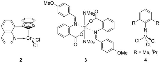 - Yuan, S.-F.; Yan, Y.; Solan, G.A.; Ma, Y.; Sun, W.-H. Recent advancements in N-ligated group 4 molecular catalysts for the (co)polymerization of ethylene. Coord. Chem. Rev. 2020, 411, 213254. [Google Scholar] [CrossRef]