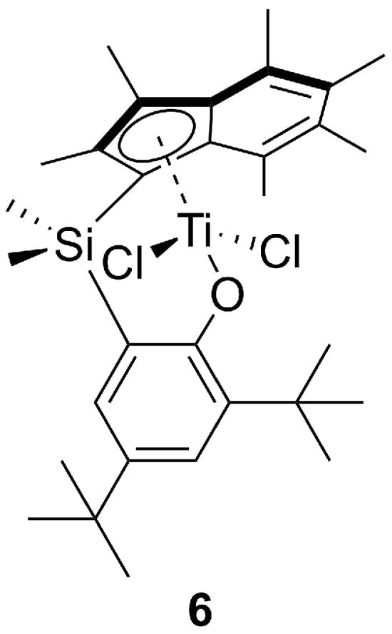 In 2021, O’Hare et al. reported a novel permethylindenyl-phenoxide (PHENI*) metallocene titanium complex (Figure 5, compound 6) and supported it on an inorganic solid carrier [61]. The activity of slurry-phase ethylene polymerization reached 3.7 × 106 gPE/(molcat·h·bar) at 60 °C when the carrier was solid MAO. Polyethylene with disentangled characteristics was obtained, and the Mw was 3.4 × 106 g/mol.