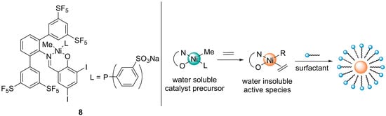 The compartmentalization of active centers is an effective means to obtain d-UHMWPE. Most metal catalysts used in olefin polymerization, such as Ti-, Zr-, V-, and Cr-centered catalysts, are water-sensitive and become inactive when exposed to water. Late-transition metals, however, have a strong water tolerance and comparatively low oxygen philicity. Mecking’s group developed a class of Ni (II) compounds that are water-tolerant, and the electronic effects and steric hindrance of the ligand structure can avoid the shortcomings of chain transfer by the β-H elimination of Ni catalysts during ethylene polymerization [70,71,72]. The water-soluble Ni(II) complex 8 (Figure 7) containing a highly electron-withdrawing substituent pentafluorosulfanyl (SF5) group can produce d-UHMWPE under aqueous conditions [73]. The pentafluorosulfanyl group is more electron-withdrawing than the commonly used trifluoromethyl (CF3) group, and thus, the utilization of a catalyst with the SF5 group can significantly reduce the undesired β-H elimination during ethylene polymerization. Under the conditions of 40 bar ethylene partial pressure and temperature of 15 °C, adding an appropriate amount of surfactant sodium dodecyl sulfate (SDS) and pH regulator CsOH·H2O, d-UHMWPE with a particle size of 25–27 nm can be obtained. The polymerization activity reached up to 4.0 × 104 gPE/(molcat·h·bar), and the molecular weight reached a maximum of 1.4 × 106 g/mol. Previous studies have shown that water-soluble catalyst precursors will first become lipophile active species that are insoluble in water during the catalytic polymerization of olefin, and the active center is surrounded by a large number of surfactants present in the aqueous solution to form a segmented independent space, which can then form a low-entanglement polymer [70]. In recent years, there has been a growing awareness of environmental protection, and aqueous polymerization, an environmentally friendly method, has gained increased attention. The advantages of aqueous polymerization include efficient heat transfer, non-toxic and non-flammable solvents, and no need for water-sensitive cocatalysts [74].