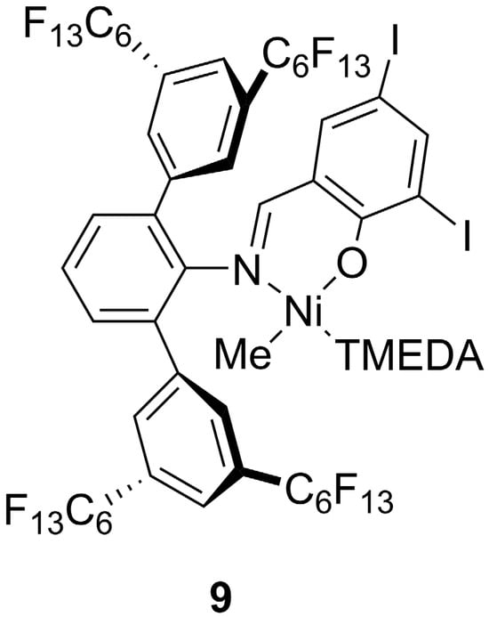 In microemulsion polymerization, each droplet can be an ideal single separation system to produce low-entanglement polyethylene. In 2021, Mecking’s group obtained d-UHMWPE by the microemulsion polymerization of lipophilic Ni(II) catalyst 9 (Figure 8) [75]. Compound 9 was synthesized in situ by N,N,N′,N′-tetramethylethylenediamine (TMEDA) dimethyl nickel and salicylaldimine. It was then dissolved in a small volume of water-immiscible organic solvent and dispersed via emulsification by ultrasonication in a large volume of surfactant aqueous solution. By polymerization at 40 bar ethylene partial pressure and 15 °C for 30 min, the d-UHMWPE with a molecular weight of 2.1 × 106 g/mol, MWD of 2.3, and particle size of 402 nm was produced. The catalytic activity was 2.1 × 104 gPE/(molcat·h·bar).