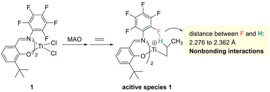 Among the widely used FI catalysts, compound 1 (Scheme 1) has a higher polymerization activity, even at a low temperature. Additionally, the weak interaction between the fluorine atom on the ligand with the β-H of the polymer growth chain inhibits β-H elimination (Scheme 1) [40]. The DFT calculation on active species 1 showed that the distance between the ortho-F atom and the β-H atom is 2.276 to 2.362 Å, which is well within the range of nonbonding interactions. The positively charged β-H is stabilized by the electron on the negatively charged fluorine atom, and the electrostatic energy between the F and H atoms is calculated to be approximately −30 kJ mol−1. The magnitude of these electrostatic energies is sufficient to reduce the transfer of β-H to titanium or reactive monomers. Therefore, compound 1 has been widely used in the preparation of UHMWPE. In 2010, Rastogi’s group reported that compound 1 could produce d-UHMWPE with a narrow MWD under the polymerization condition of low temperature and low catalyst concentration [41]. With the use of methylaluminoxane (MAO) as a cocatalyst and 1.3 μmolcat/L toluene solution of compound 1, d-UHMWPE with a molecular weight of up to 9.1 × 106 g/mol and polymer dispersity index (PDI) between 1.3 and 2.6 was obtained under room temperature and atmospheric pressure. Key conditions to low entanglement are low temperature and low catalyst concentration, so as to ensure that there is enough distance between the active centers and a greater crystallization rate.