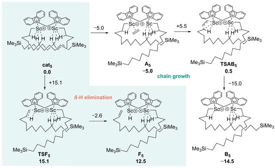 Energy profiles for the chain growth and β-H elimination of ethylene polymerization catalyzed by 5 from the DFT simulation (ΔG, kcal mol−1).