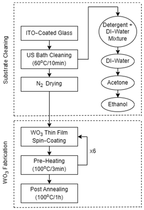 Tungsten hexachloride (WCl6), 30% hydrogen peroxide (H2O2), lithium perchlorate (LiClO4), propylene carbonate (PC), acetonitrile (ACN), and polymethylmethacrylate (PMMA) were purchased from Sigma-Aldrich, Rockville, MD, USA. Glacial acetic acid (HoAc [CH3COOH]) was obtained from the BASF Chemical Company, Ludwigshafen, Germany. Subsequently, absolute ethanol (EtOH, C2H6O) was purchased from Merck, NJ, USA. The ITO was obtained from the Han Xin Industry Co., Ltd., Shanghai, China. All chemicals utilized in this study were of analytical grade and were used as received without any further purification.