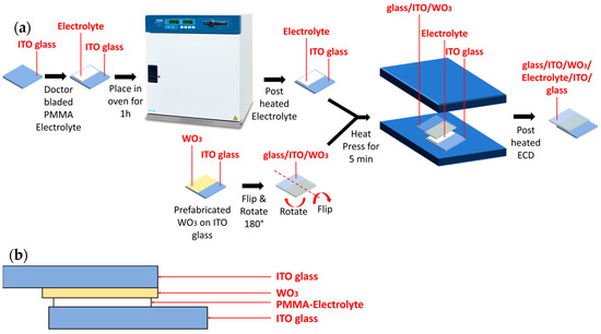 In this study, five ECDs were fabricated with the structure of glass/ITO/WO3/electrolyte/ITO/glass, while an additional five devices were assembled for electric impedance spectroscopy (EIS) characterization with the structure of glass/ITO/electrolyte/ITO/glass. For each varying temperature, one ECD and one EIS device were used for measurements. In the ECD structure, the electrolyte was doctor-bladed on a pre-cleaned ITO glass substrate after masking the edges and leaving an active area of 22 × 12 mm and a spacing of 0.52 mm using Kapton tape. Next, substrates were placed in the oven separately at varying temperatures (25, 40, 60, 80, and 100 °C) for 1h. Following that, the prefabricated WO3 samples were heat-pressed on the glass/ITO/electrolyte samples each at the corresponding temperature for 5 min (25 °C oven → heat-pressed at 25 °C, etc.). For the EIS structure, the assembly steps were the same as in the ECD structure except that a pre-cleaned ITO glass substrate was heat-pressed on the glass/ITO/electrolyte piece instead. Figure 2a,b illustrate the fabrication process and final ECD, respectively.