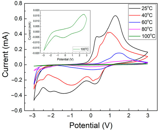 The CV graphs for all samples at different temperatures for the electrolyte used in ECD with the glass/ITO/WO3/electrolyte/ITO/glass structure.