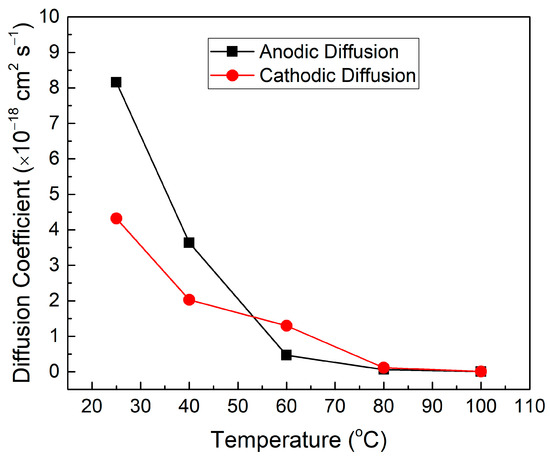 Figure 4 demonstrates the D for all samples during the anodic and cathodic cycles. From the graph, it can be discerned that the D in both anodic and cathodic cycles decrease as the temperature increases.