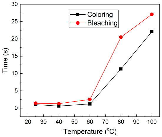 As observed in Figure 5, the coloration and bleaching times increase as the temperature increases. From Table 2, the lowest coloration and bleaching times belong to the 25 and 40 °C samples with values of 1 s/1.4 s and 0.6 s/1.3 s, respectively. The 100 °C sample reported the highest coloration and bleaching times with a value of 22.1 s and 27.1 s, respectively. The increase in the coloration and bleaching times as temperatures increase can be due to the increase in the polymer electrolyte hardness, which inhibits the movement of the ions from and into the electrolyte layer; this supports the previous argument. The faster coloration time compared to the bleaching time can be related to the higher ionic conductivity in the colored state compared to the bleaching state [28].
