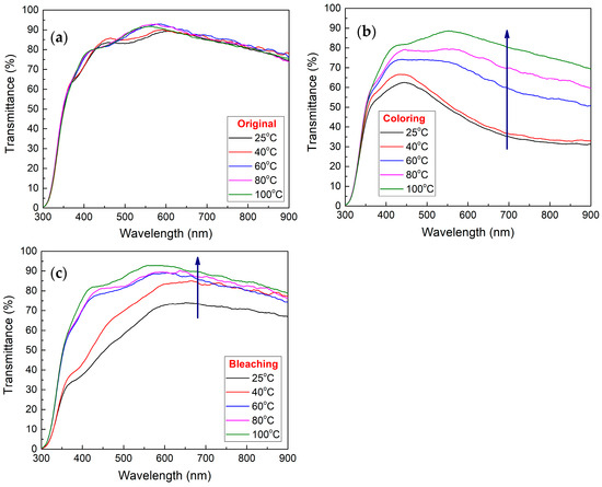 The transmittance graph was recorded for the fresh samples before any characterization (Original transmittance), and when applying a negative (−ve) potential (Coloring transmittance, −3 V) and a positive (+ve) potential (Bleaching transmittance, +3 V). Figure 6 shows the transmittance graphs for all samples in original (a), bleaching (b), and coloring (c) transmittances. From Figure 6, it can be observed that all samples have a good transmittance prior to any use in the original transmittance graph (Figure 6a) specifically in the visible region and a slight blocking for infrared radiation in the NIR region. In Figure 6b,c, coloring and bleaching showed a tendency to increase with the increase in temperature. For the coloring, this can be due to the limited charges inserted from the electrolyte owing to the increase in crystallinity of the polymer matrix as the temperature increases.