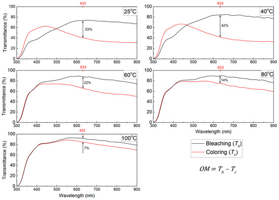 The optical density (OD) and optical modulation (OM) are calculated for all samples at the 633 nm wavelength using Equations (1) and (2), respectively: