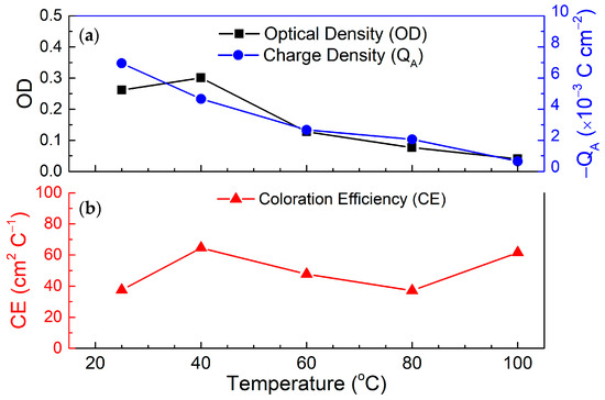 (a) The ΔOD, QA, and (b) CE as a function of temperature for the electrolyte used in the glass/ITO/WO3/electrolyte/ITO/glass structure.