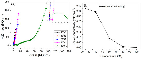 From Figure 9b, it can be observed that the σ decreased as the temperature increased. The decrease in ion conductivity can be attributed to the decrease in ion mobility due to the transitioning of the solid matrix to completely solid as more trapped solvents are being evaporated as the temperature increases [29]. Based on the distinct Nyquist plot observed in Figure 9 for the 100 °C sample, it is suggested that the near-complete evaporation of the propylene carbonate solvent has resulted in the formation of a predominantly PMMA-LiClO4 solid electrolyte, where the conductivity is governed by diffusion and cationic transport along the polymer chains rather than lithium−ion transport in the liquid phase.