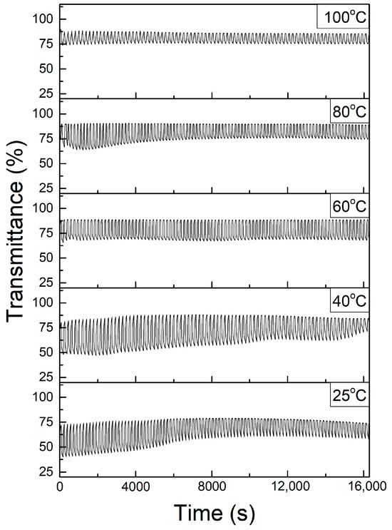A stability test was conducted for all samples to determine the durability of the samples under consequent coloring and bleaching. The samples were applied to a constant voltage of −3 V (coloring) and 3 V (bleaching) for a duration of 100 s and 60 s for 100 cycles, respectively. Coloring and bleaching transmittances were recorded during the coloring and bleaching cycles. Figure 10 shows the stability graphs for all samples.