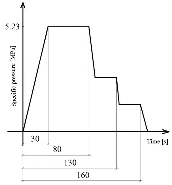 Three-layer particleboards were produced under laboratory conditions. Particleboards were made with the dimensions of 400 × 300 × 16 mm, and their calculated, density condition at 20 °C and 65% relative humidity was 620 ± 10 kg/m3. UF adhesive with the indispensable hardener and paraffin emulsion were applied on the conditioned wood particles in a laboratory rotary mixing device (Technical University in Zvolen, Slovakia). The adhesive was applied by using a pressure of approximately 4.5 bar onto the falling stream of particles at the center of the rotating drum device. The moisture content of the wood particles for the surface layers after applying the adhesive was 9.7 to 10.5%, and the moisture content of the wood particles for the core layer after applying the adhesive was 6.1 to 6.9%. The particle mat was layered manually in relevant rectangular forms positioned on an aluminum siliconized plate to prevent adherence between the particleboard produced and the plate. The surface/core particle ratio was 33/67. The particle mat was (a) cold pre-pressed in a room-temperature environment at a pressure of 1 MPa before the rectangular form was removed; after removing the form, the particle mat was covered with a second aluminum siliconized plate and transferred to the laboratory hot press, and (b) pressed in the laboratory single-opening press CBJ 100-11 (TOS, Rakovník, Czech Republic); pressing was conducted in accordance with the pressing diagram (Figure 1) at a maximum temperature of 240 °C, a maximum pressure of 5.23 MPa. The pressing factor used for particleboard pressing was 10 s/mm. After hot pressing, particleboards were cooled at ambient conditions, then edge-trimmed, and finally stored in a climate chamber at 20 °C and 65% of relative humidity within 14 days before sample cutting. In total, 60 particleboards were manufactured, i.e., six of each type (Table 2).