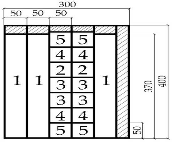 Cutting scheme for laboratory-manufactured particleboard: 1—samples for testing modulus of rupture and modulus of elasticity by 3-point bending test [43], 2—samples for testing thickness swelling and water absorption after 2 and 24 h [41,42], 3—samples for testing internal bond strength [44] and density [39], 4—samples for testing density profiles [46], and 5—spare samples.