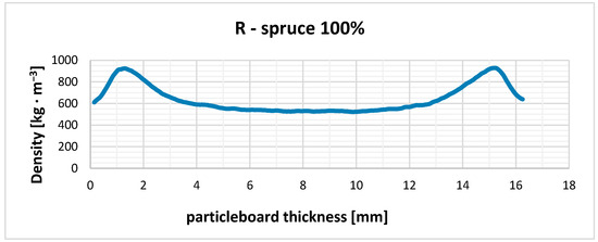 Density profile of particleboard consisting exclusively of spruce particles in all three layers (comparison board—R).
