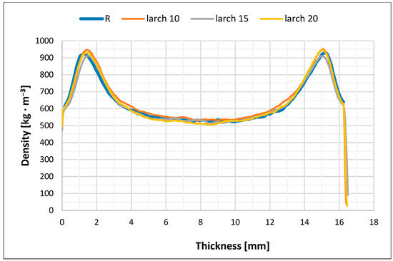 Density profile of particleboard consisting of refined spruce particles in surface layers and coarse particles of larch (10%, 15%, and 20%) and spruce (balance up to 100%) in core layer (L10–L20).