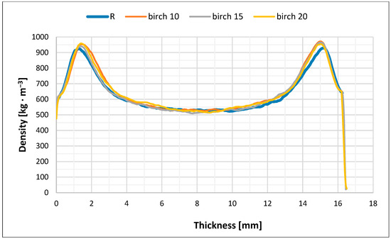 Density profile of particleboard consisting of refined spruce particles in surface layers and coarse particles of birch (10%, 15%, and 20%) and spruce (balance up to 100%) in core layer (B10–B20).