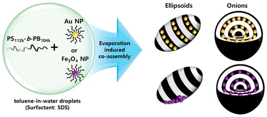 J. Shin et al. [49] analyzed the effect of MNPs on the nanostructure of nanocomposites formed by symmetric poly(styrene-b-1,4-butadiene) (PS-b-PB) BCP with Fe3O4 or Au nanoparticles, comparing the effect of NP type as well as their placement at the nanodomains. They first synthesized Au and Fe3O4 nanoparticles stabilized with oleyl ligands. The confined co-assembly of symmetric poly(styrene-b-1,4-butadiene) (PS-b-PB) BCP and NPs in evaporative emulsions resulted in particles with various morphologies, including striped ellipsoids, onion-like particles, and their intermediates. The main difference among PS-b-PB/Au and PS-b-PB/Fe3O4 was in the distribution of NPs, which affected the overall particle morphology. In the case of PS-b-PB/Fe3O4 ellipsoids, MNPs clustered and segregated to the particle/surrounding interface of the ellipsoids, being selectively placed in the middle of the PB domains in a string-like pattern for PS-b-PB/Fe3O4 onion-like particles. The scheme of the employed procedure is shown in Figure 2.