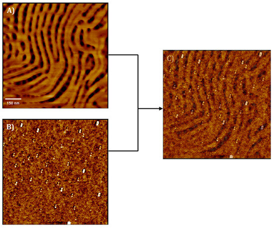 Figure 4. (A) AFM-phase image of the as-cast nanocomposite films with 1 wt% nanoparticles, (B) AFM-phase image of nanocomposite film with 1 wt% nanoparticles exposed to UV light irradiation for 48 h, and (C) superposition of (A,B). (Reproduced with permission from Ref. [60], copyright Elsevier 2016).