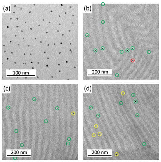 Figure 5. TEM images of the BCP films with 0.1 wt% FePt NP. (a) shows the pure FePt NPs, while (bd) are different images of the lamellar PS-b-PMMA morphology with 0.1 wt% FePt NPs. The particles are marked with a green ring in the light PMMA phase, red in the dark PS phase, and yellow on the boundary [32].