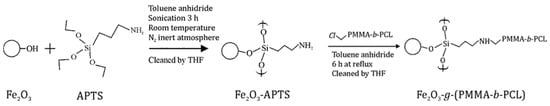 By this method, I. Barandiaran et al. [65] grafted a poly(methyl methacrylate-b-ε-caprolactone) (PMMA-b-PCl) diblock copolymer to the surface of Fe2O3 MNPs to prepare thin-film nanocomposites with poly(styrene-b-ε-caprolactone) (PS-b-PCl). They employed the ATRP polymerization technique to prepare a PMMA-b-PCl copolymer (21,000 g/mol) presenting terminal chlorine groups. MNPs were silanized with 3-aminopropyltryethoxysilane (APTS).